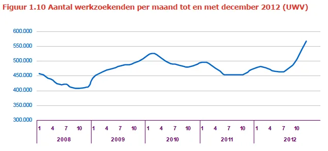 Uit cijfers van het UWV is gebleken dat het aantal werkzoekenden is gestegen in 2012. In 2012 zijn 96.000 (20 procent) meer werkzoekende gemeten dan in 2011.