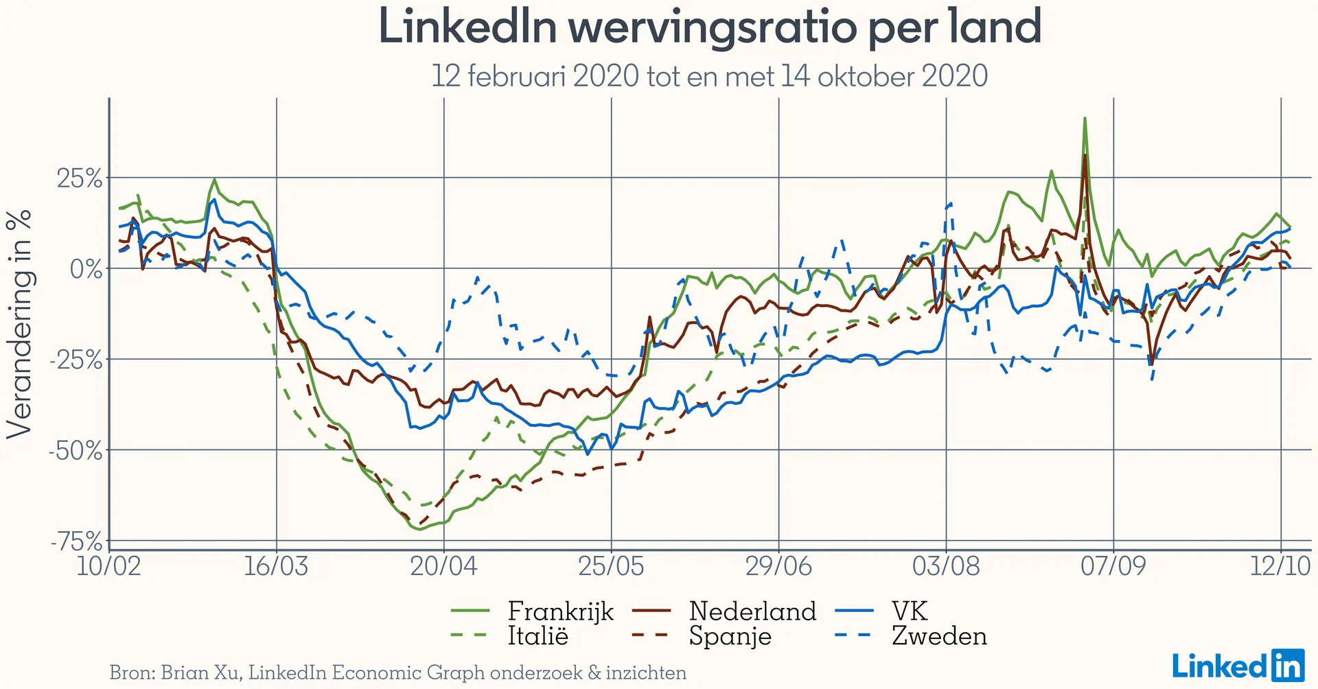 LinkedIn data toont dat het wervingspercentage op het platform in maart en april sterk daalde en in mei een dieptepunt van -38% bereikte. Nu lijkt de werving van nieuw personeel te stagneren.