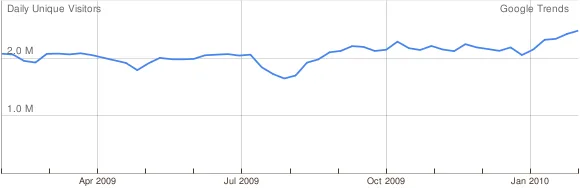 De afbeeldingen tonen het aantal unieke bezoekers uit Nederland van de afgelopen 12 maanden. De dipjes eind december 2010 zijn te verklaren door de kerstperiode waarin het internetverkeer minder is.