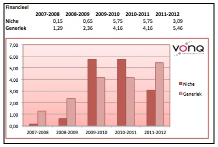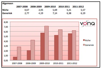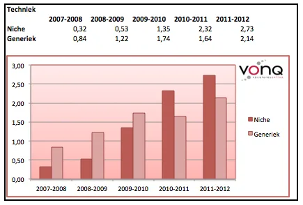Als we dit verder opsplitsen naar branche valt op dat sites die zich richten op een niche een aanzienlijk sterkere groei hebben doorgemaakt. Binnen enkele branches zoals ICT en Techniek presteren nichesites momenteel zelfs beter dan generieke sites!